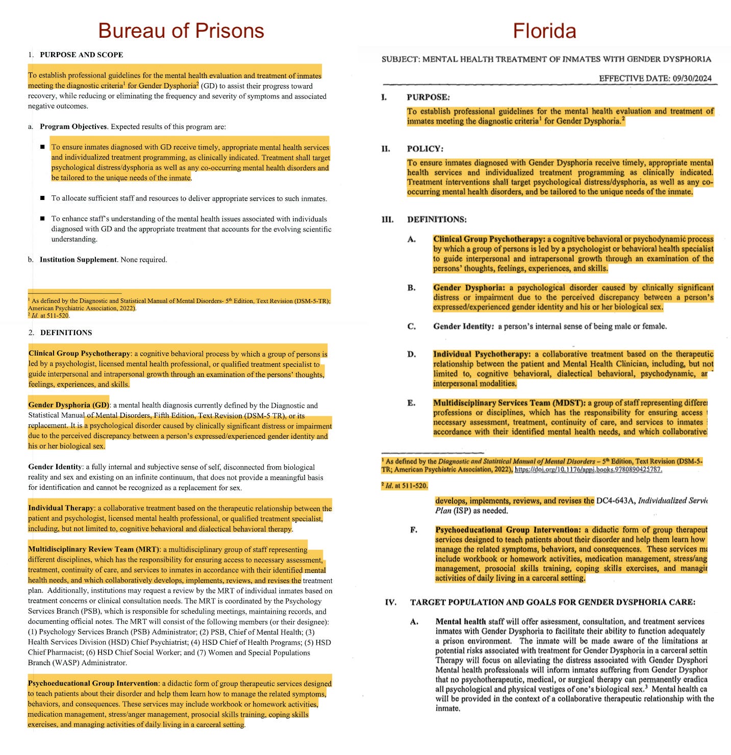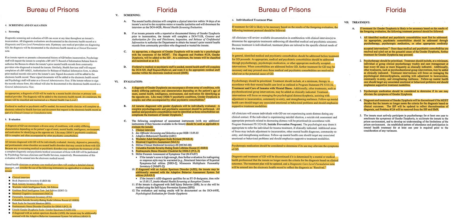 There are a few components of the policy that make this fact clear, and the first is actually that the BOP didn’t even write a large chunk of this policy. Rather, it copied significant portions of the policy that Florida implemented in September 2024—in many places word-for-word. See this comparison, with identical parts highlighted, below: